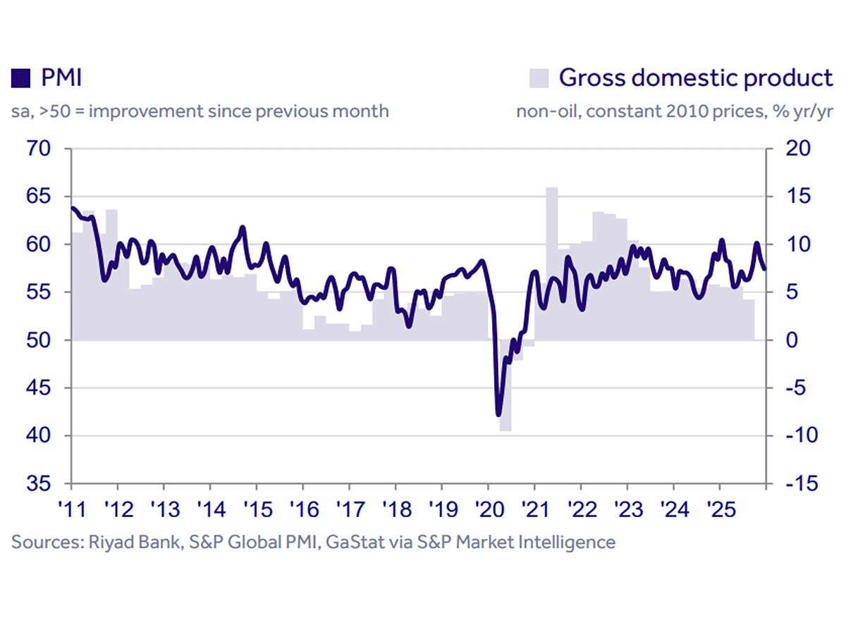 The non-oil private sector in Saudi Arabia maintained its expansionary trend throughout 2025, although the pace of growth slowed slightly in December. According to the latest Riyad Bank PMI data, the headline index dropped to 57.4 from 58.5 in November, marking the second consecutive monthly decline. Despite this, the index remained well above the 50-point threshold that separates growth from contraction and was marginally higher than its long-term average of 56.9.